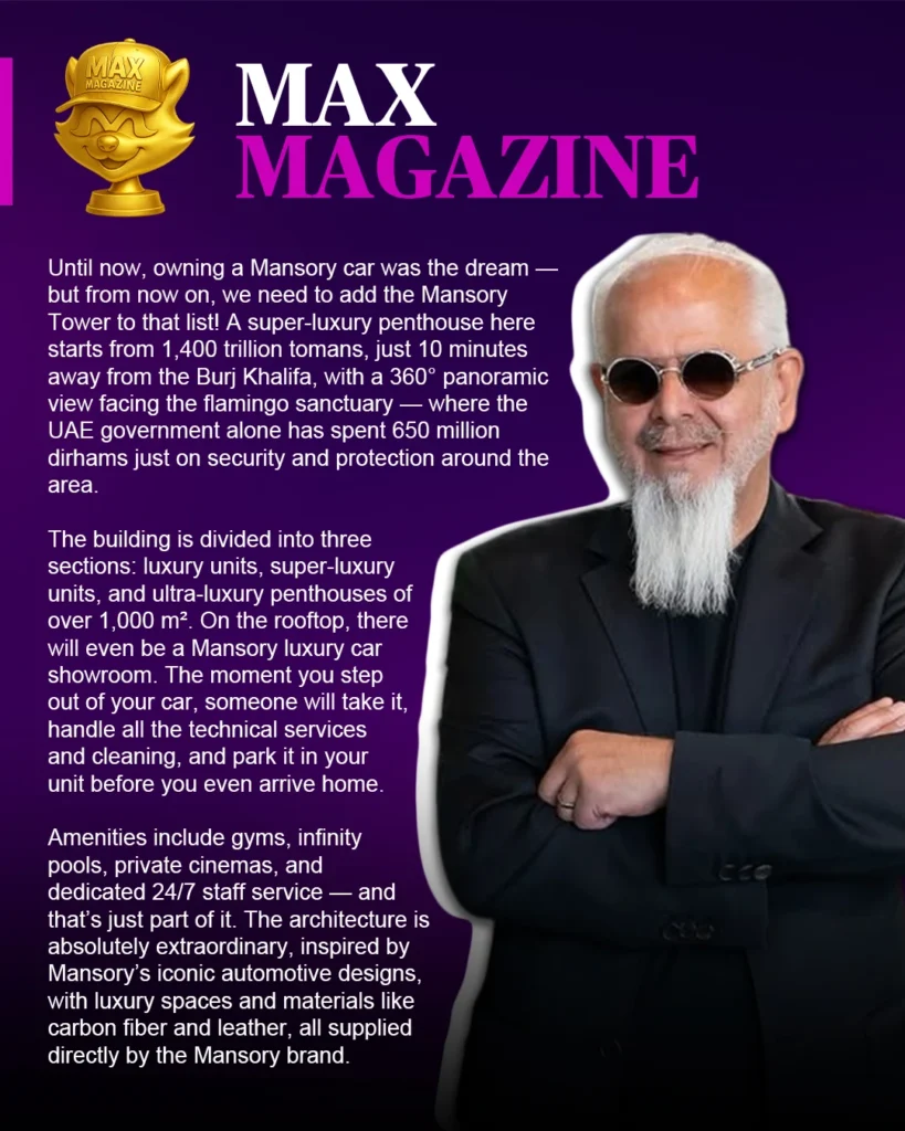 The Mansory Tower (formally Mansory Residences) is a super-luxury residential development in Dubai, created through a collaboration with the iconic automotive design house, Mansory. Its architecture is inspired by Mansory’s signature style, utilizing high-end materials like carbon fiber and leather supplied directly by the brand. The location is strategically positioned in the Meydan/Ras Al Khor area, offering a 360° panoramic view of the city skyline and the protected Flamingo Sanctuary (Ras Al Khor Wildlife Sanctuary), a location just about 10 minutes from the Burj Khalifa.Achievements