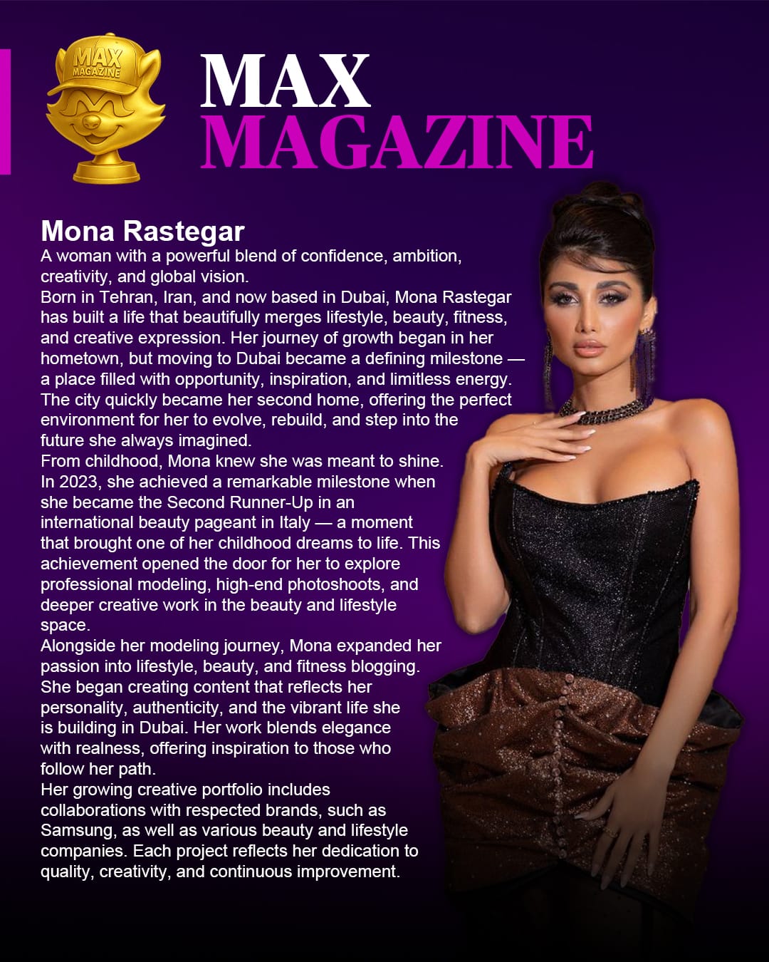 Mona is a lifestyle, beauty, and fitness content creator based in Dubai. Originally from Tehran, she moved to Dubai to pursue personal and professional growth and to build the future she always envisioned. In 2023, she earned second place in a beauty pageant in Italy, which opened the door to modeling opportunities, professional shoots, and collaborations with well-known beauty and lifestyle brands. Today, she continues to grow her presence as a creator, sharing her journey, daily lifestyle, and inspirations with her audience across Dubai.
