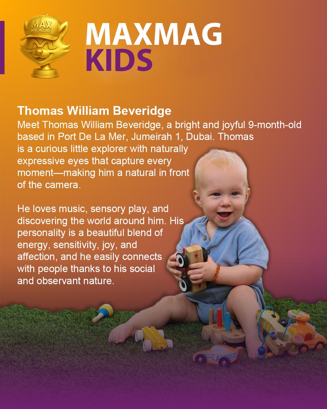 Thomas William Beveridge is a bright and curious 9-month-old based in Port De La Mer, Jumeirah 1, Dubai. He loves exploring new things, reacting to sounds and textures, and engaging in playful sensory activities. His expressive eyes and natural charm make him stand out in photos. Thomas is being raised by his parents, Emma and Stuart Beveridge, who support his joyful and active nature.