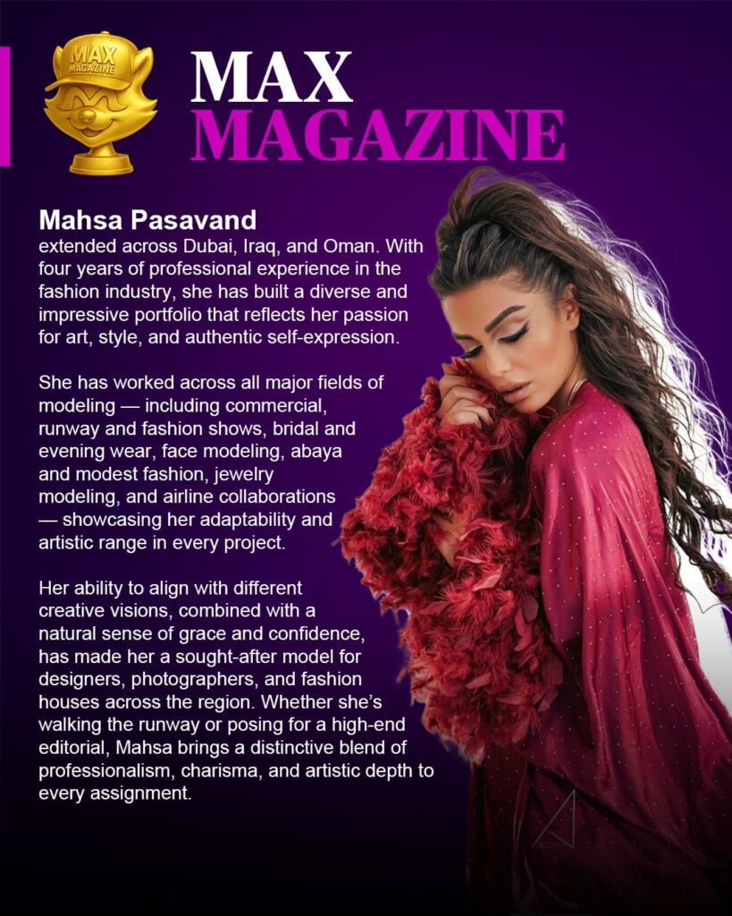 Mahsa Pasavand is a professional model originally from Tehran, now based in Dubai. She has built a strong presence across the Middle East, working in Dubai, Iraq, and Oman. Known for her elegance, confidence, and versatility, Mahsa brings life to every project she’s part of—from high-fashion campaigns to bridal and jewelry shoots. Her journey reflects passion, creativity, and a deep appreciation for beauty and culture.