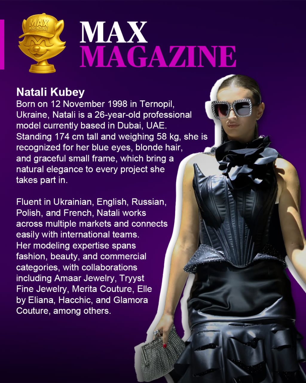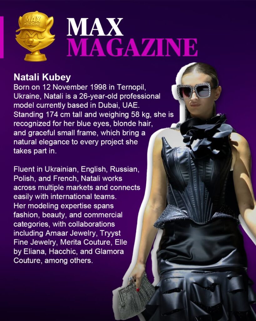 Born on November 12, 1998, in Ternopil, Ukraine, Natali Kubey is a Ukrainian model who has made her mark in the heart of Dubai’s luxury fashion scene. With her striking blue eyes, blonde hair, and effortless grace, Natali brings a unique charm to every project she takes on. Known for her versatility, she seamlessly transitions from high-fashion editorials to elegant commercial campaigns, proving that true style has no limits.