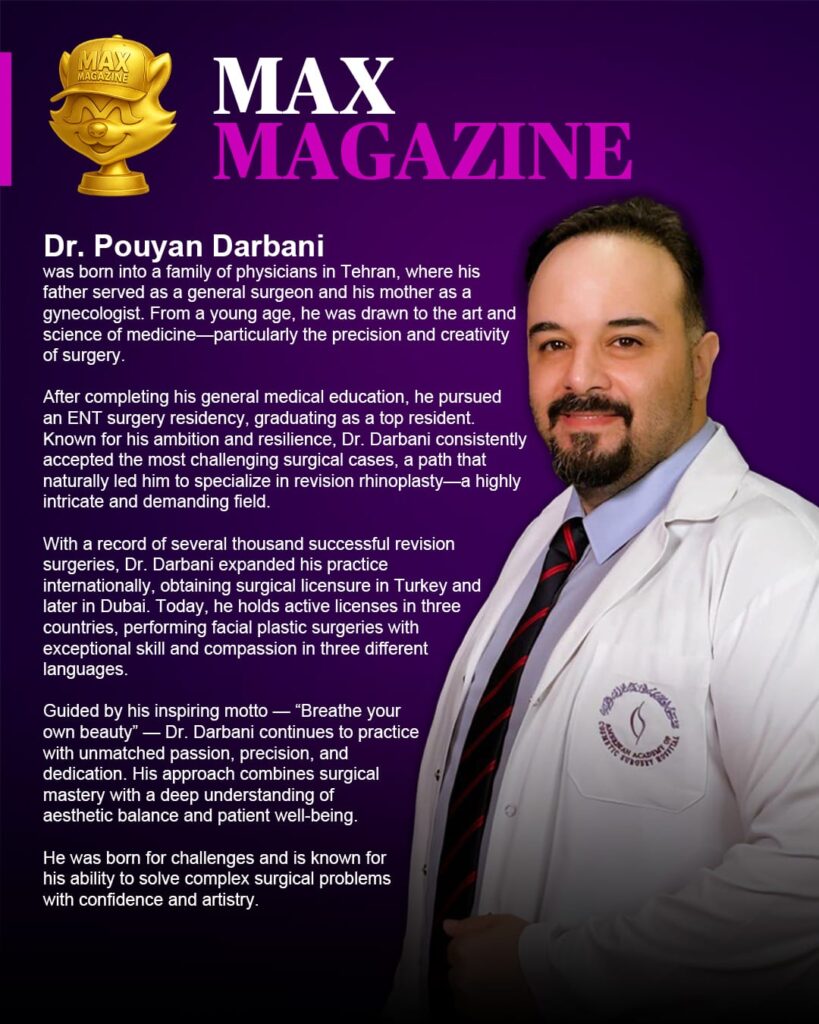 Dr. Pouyan Darbani was born in Tehran into a family of physicians—his father a general surgeon and his mother a gynecologist. From a young age, he was drawn to medicine and surgery, following in his parents’ footsteps. After completing his general medical education, he pursued an ENT surgery residency, where he graduated as the top resident. His determination and willingness to take on complex surgical cases led him to specialize in revision rhinoplasty. Over the years, he has performed several thousand successful revision surgeries and expanded his practice internationally, earning medical licenses in Turkey and Dubai. Fluent in three languages, Dr. Darbani currently practices facial plastic surgery at the highest level across three countries.
